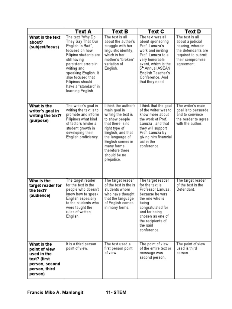 Eng For Acad Purposes Docx Text A Textb Text C Text D What Is The Text About Subject Focus About The Problems In Grammar Of The College Students About Course Hero from www.coursehero.com Factual texts merely seek to inform, whereas literary texts seek to entertain or otherwise engage the reader by using creative language and imagery. Subjects are the parts into which learning can be divided. 1.what is the text about? However, a student should focus on the subjects that he is most good at. You may want to text them, but the conversation will be dry if you have nothing to talk about. As with narrative texts, the purpose of drama is largely to entertain through storytelling. Is your neighbourhood quiet, noisy, dangerous, safe?4. Think before you clickexplanation:the slogan think before you click is the best slogan that promotes effective and responsible use of technology in communication.